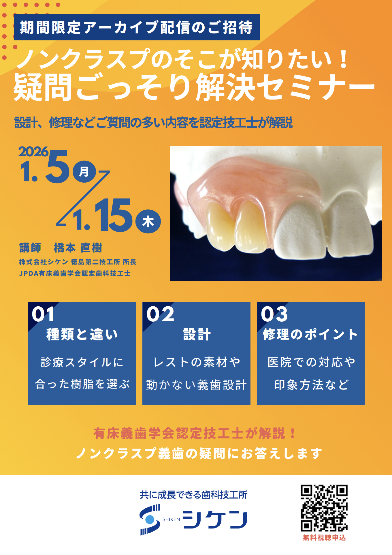過去最多のお申込み数をいただき、内容も大好評だったノンクラスプ義歯セミナーの【期間限定再配信】が決定しました!本セミナーでは、有床義歯学会認定歯科技工士が、ノンクラスプ義歯の修理や設計について、日頃よくいただくご質問を中心に、分かりやすく解説します。30分でご視聴いただける内容ですので、ぜひお気軽にお申込みください。
