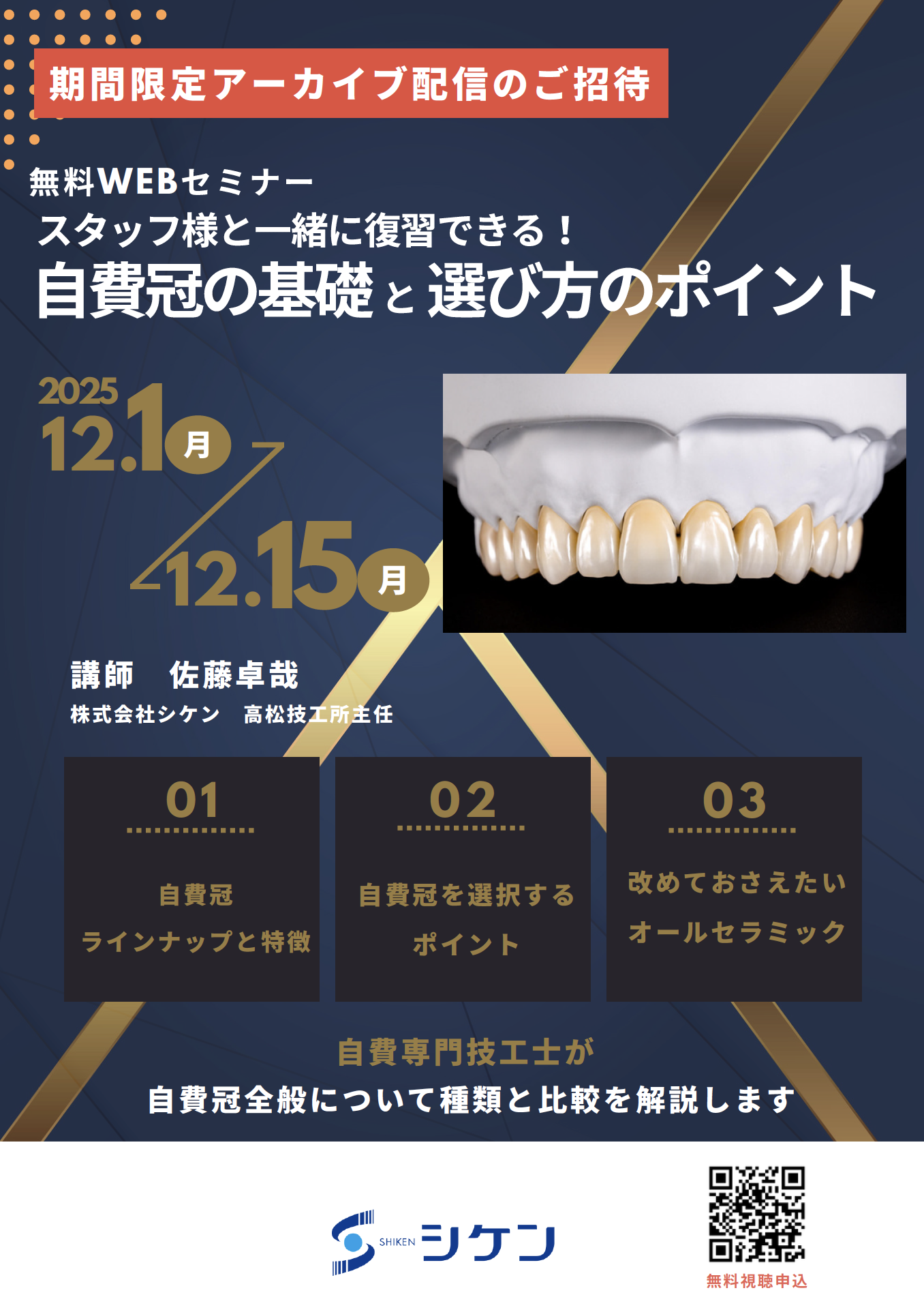 年末に向け自費需要が増える中、スタッフ様と一緒に自費冠について復習しませんか?今回のセミナーでは、自費冠の種類や比較、選ぶ時のポイントなどをご紹介します。スタッフ様とご覧いただくことで、患者様への紹介の仕方について見直すきっかけにもしていただけます!30分でみれちゃいますので、ラインチタイムセミナーとしてもご活用いただけます。
