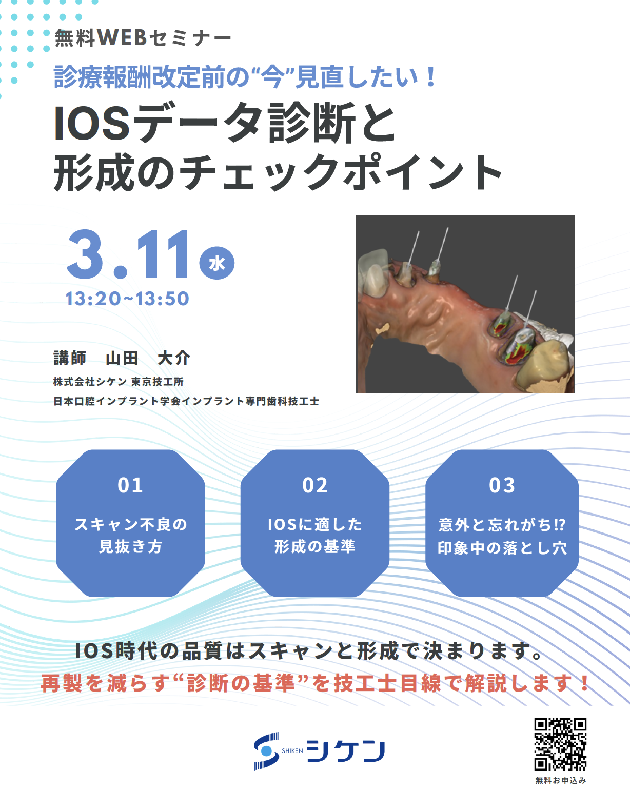 本WEBセミナーでは、IOSデータの“診断”と、IOSに適した“形成”のチェックポイントを、現場目線でコンパクトに解説します。