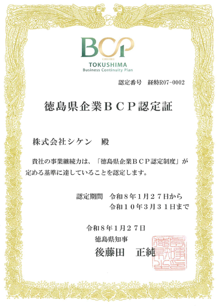 当社は、災害や感染症などの緊急事態においても事業を中断させない、あるいは早期再開を目指すための「事業継続計画(BCP)」を策定し、この度、徳島県より「徳島県BCP認定企業」として認定を受けました。